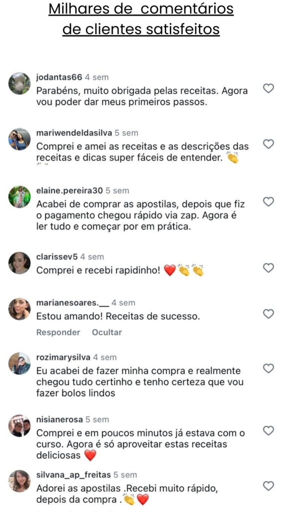 Essa apostila é minha queridinha, só com essas receitas conseguir aumentar em mais de 30% as minha vendas que me gera mais de mil reais a mais nas minha vendas só com essas receitas e por muito tempo deixei ela guardada e hoje decidir liberá las para você como bônus, mais é apenas para as 5 primeiras pessoas.